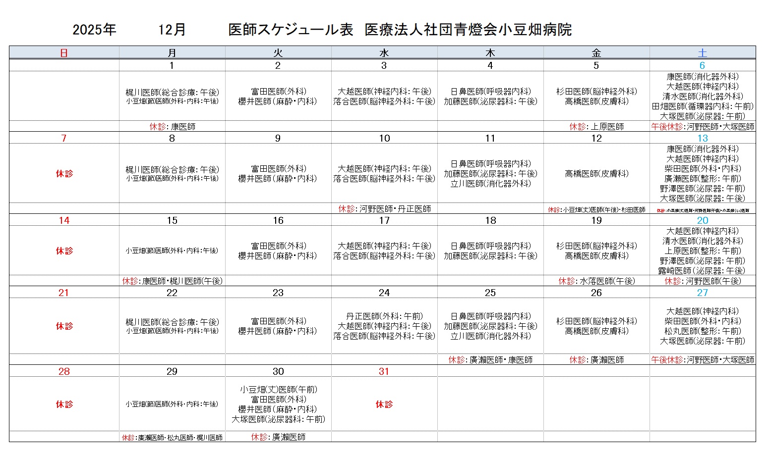 2025年12月医師スケジュール