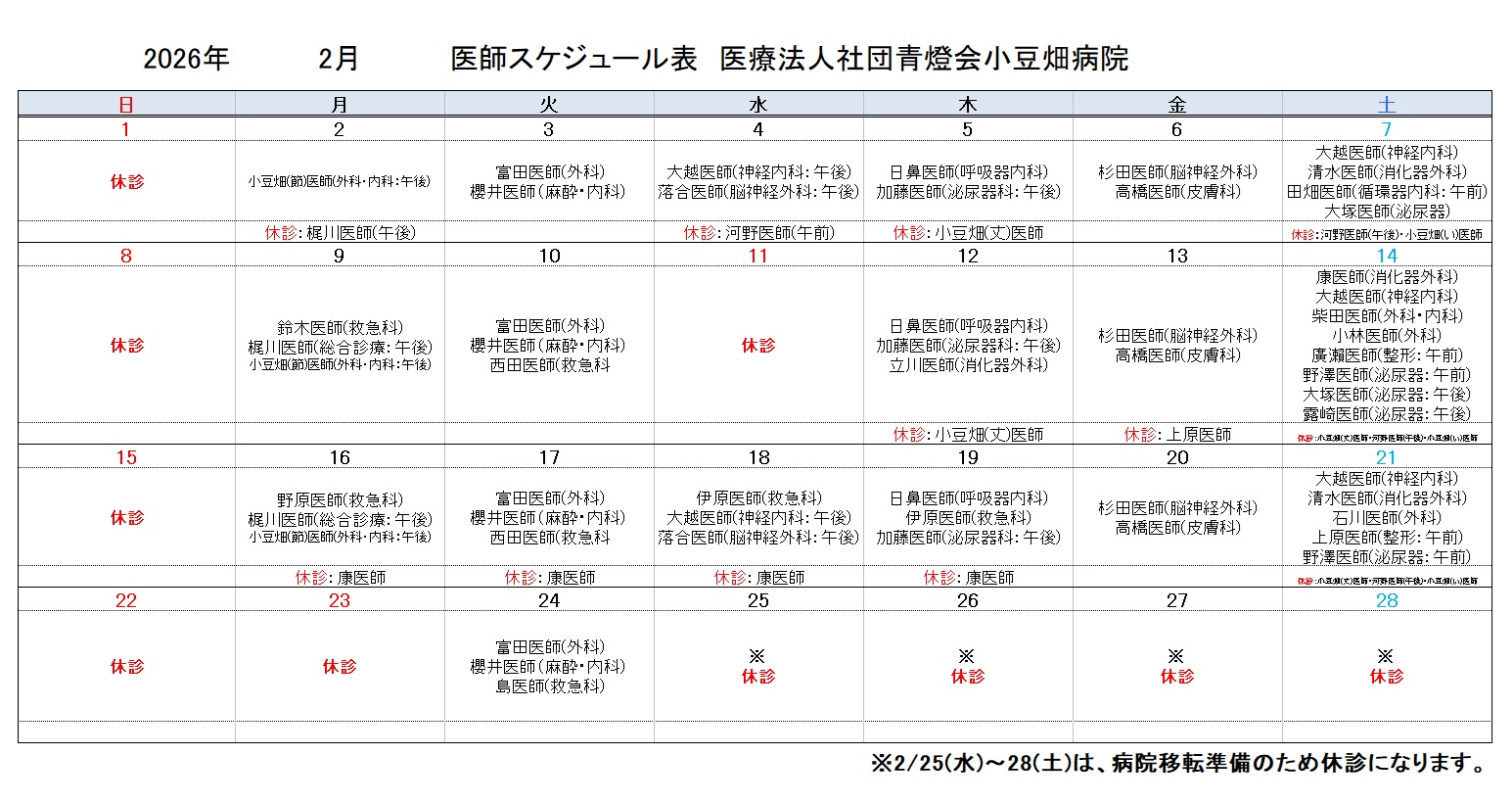2026年2月医師スケジュール